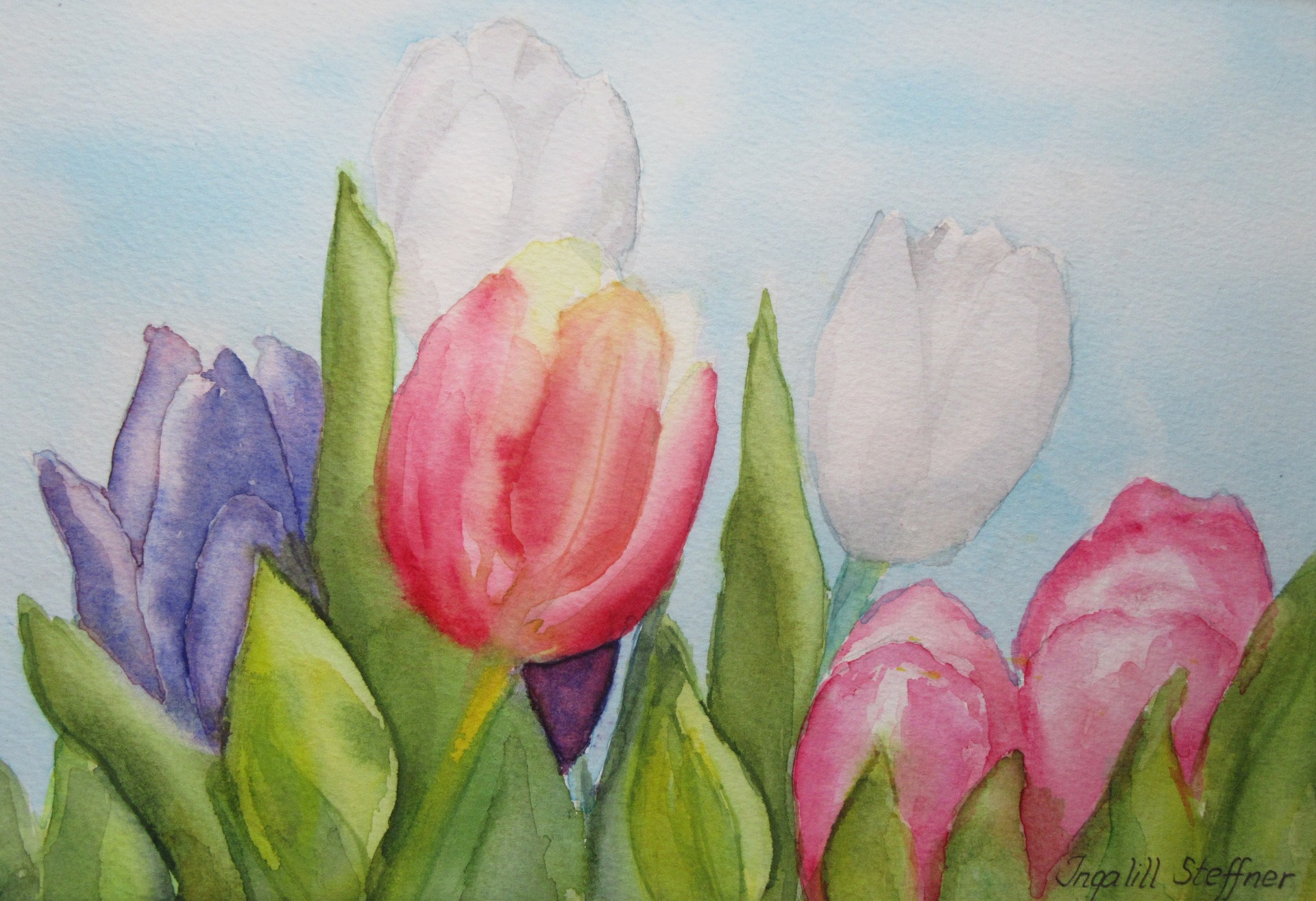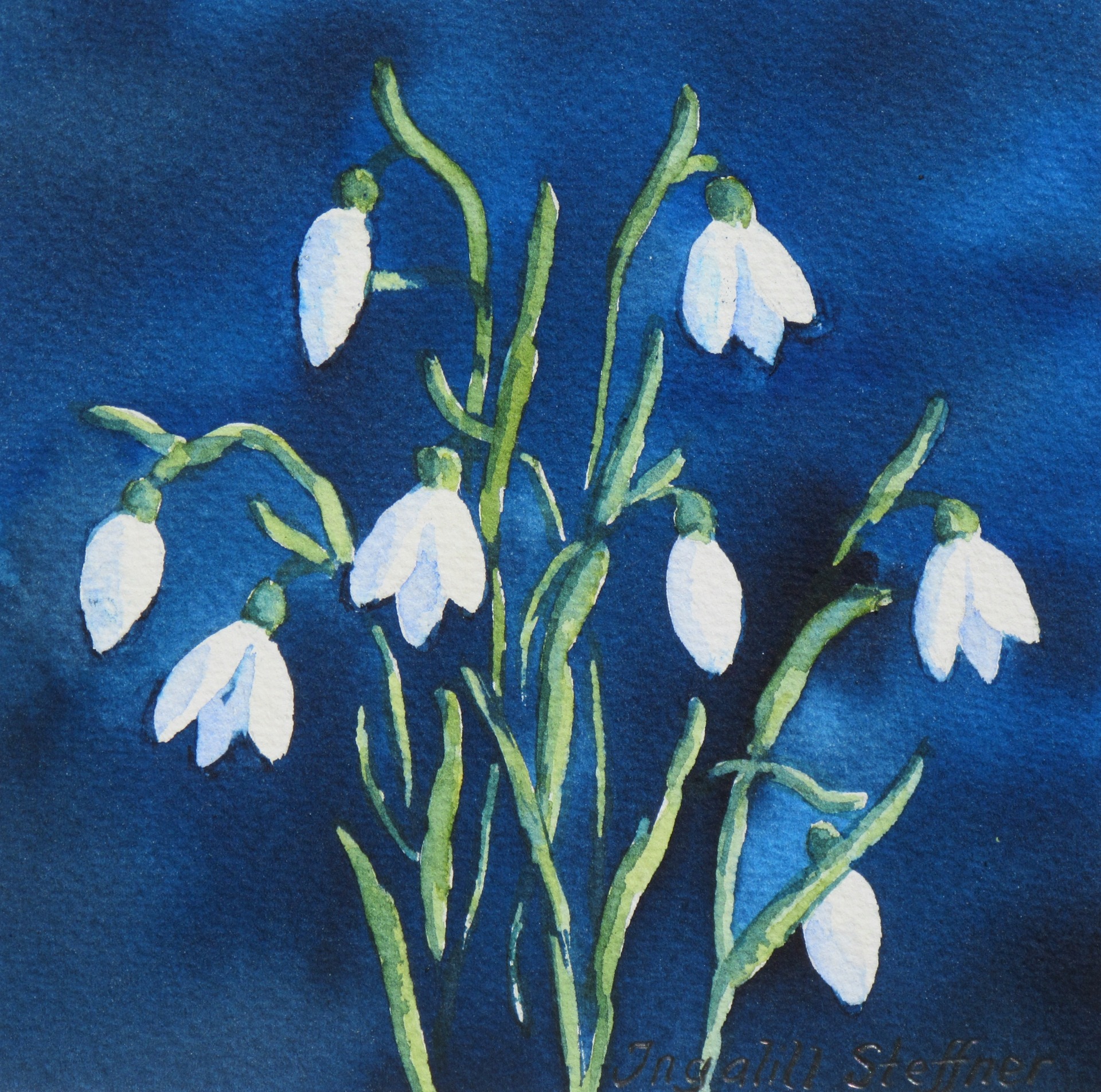 Jag målar oftast blommor från fotografier jag tagit. Ibland målar jag en blomma realistiskt och bladen lite mer abstrakta. Det händer att jag sitter ute vid min sommarrabatt och målar några blommor, men det är inte alltid lätt när vinden tar tag i en riddarsporre, och jag skall försöka fånga de små blommorna på stängeln för att omedelbart därefter få ner dem på pappret med min pensel ! Blad har jag tidigare inte tyckt om att måla - det är så svårt med grönt, att få fram fina nyanser - men övning ger färdighet, och jag är inte lika rädd för det gröna som tidigare.